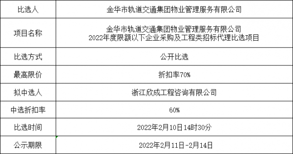 金華市軌道交通集團(tuán)物業(yè)管理服務(wù)有限公司2022年度限額以下企業(yè)采購(gòu)及工程類(lèi)招標(biāo)代理比選項(xiàng)目中選公示